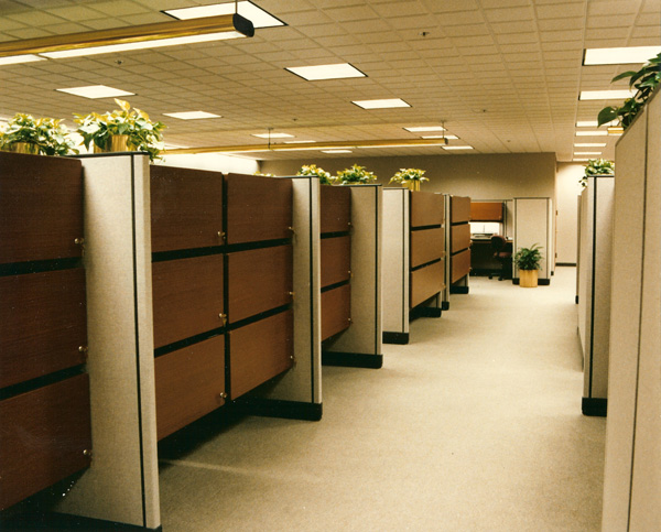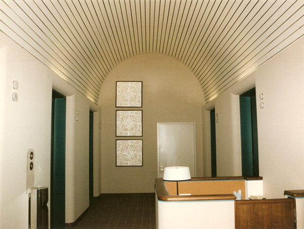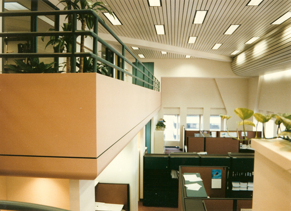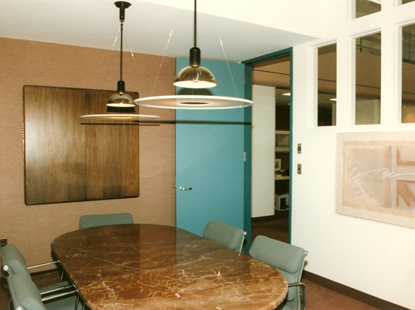 Adaptive reuse of the remainder of a double height mechanical space in an early Financial District high rise office tower into innovative office space for a financial institution. The elevator lobby and adjacent offices were updated with curved aluminum ceiling system, radiused corners and contemporary finishes.