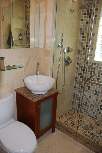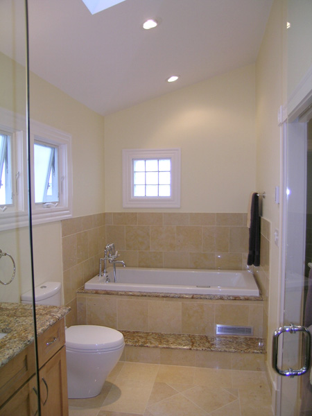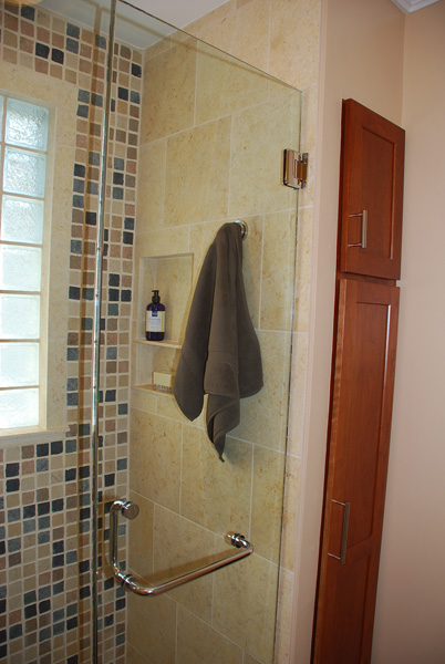 Residential dormer addition to a 1910 two family house, comprising a custom designed four piece bathroom with cathedral ceiling, frameless glass shower enclosure, glass block windows, intricate Jerusalem Stone and granite tile work. Three existing bedrooms and the connecting stair and hall were modernized with built in cabinetry and updated lighting and skylights.